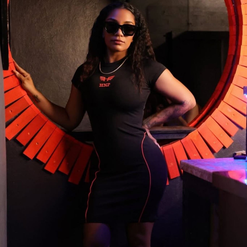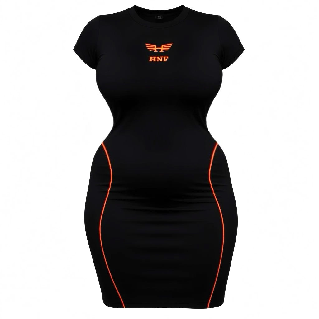 Meet your new favorite statement dress. The HNF Neon stitch bodycon collection that blends with luxury stretch fabric with vibrant neon accents that glow in any setting. Sculpted to perfection, this dress hugs your curves while giving you that effortless nightlife confidence.